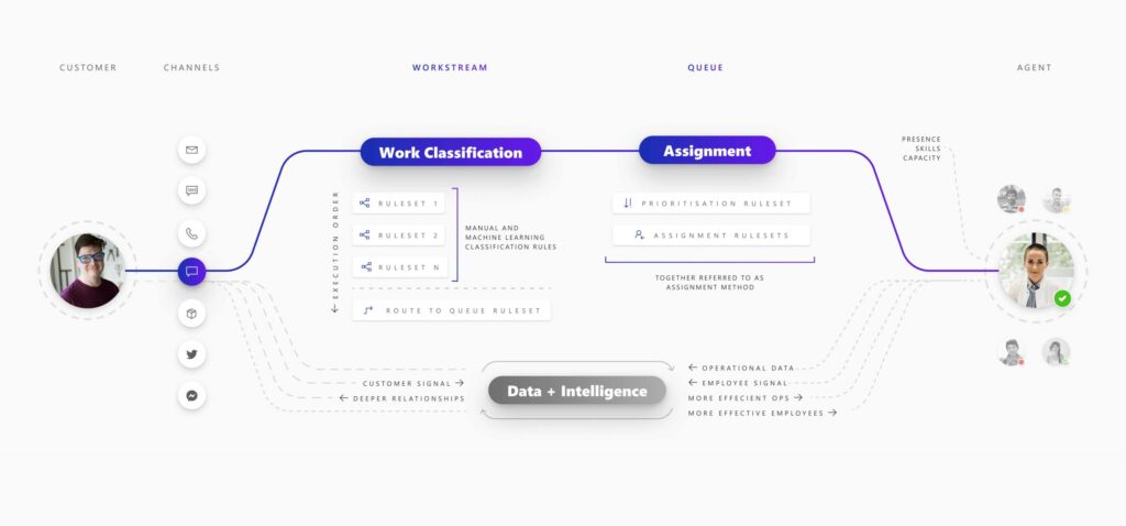 Deze intelligente routering geldt voor alle serviceverzoeken die binnenstromen vanuit alle kanalen (omnichannel: cases, entiteiten, chat, digitale berichten en spraak).