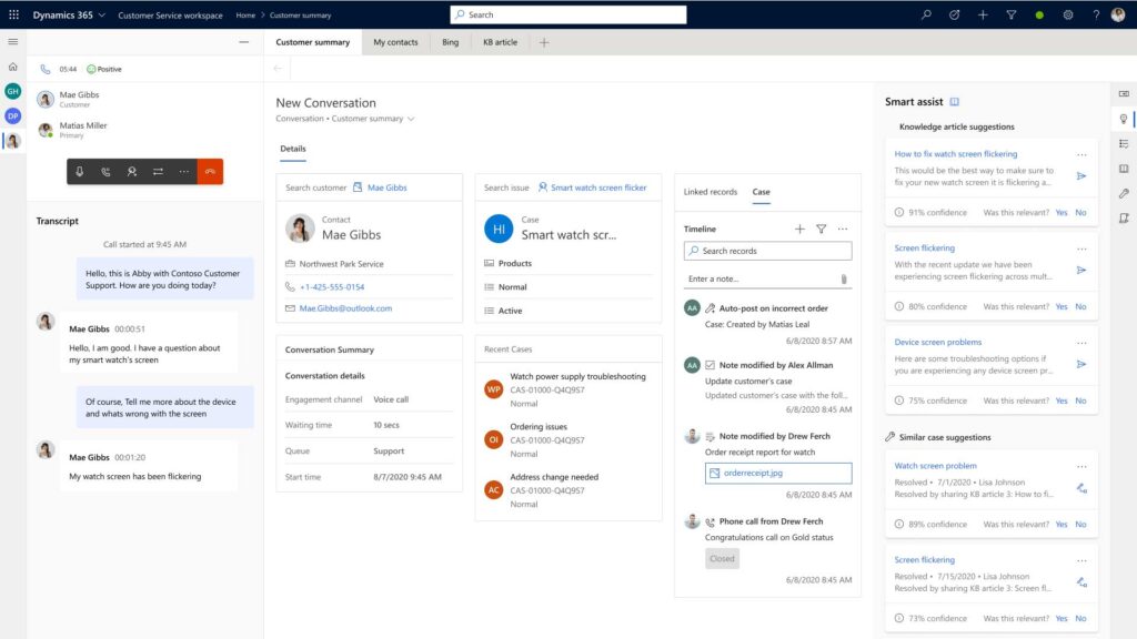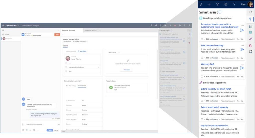 Een handige feature in Dynamics 365 Customer Service zijn de AI-suggesties voor kennisartikelen en vergelijkbare cases die eerder met succes zijn opgelost. De AI-suggesties worden weergegeven in “Smart Assist” (zie screenshot hieronder), een intelligente assistent die in realtime aanbevelingen geeft. Dankzij deze aanbevelingen kunnen klantendienstmedewerkers sneller problemen van klanten oplossen.
