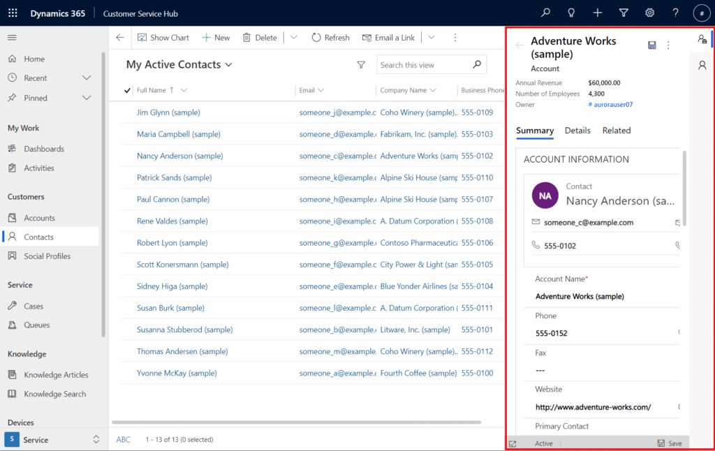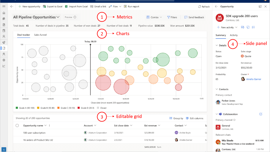 Via het bewerkbaar raster krijgt u een overzicht van de opportuniteiten, weergegeven in een lijst weergegeven. Maar u kan ook snel aanpassingen maken aan de records vanuit hetzelfde raster. Ook via de gelinkte kolommen via het zijpaneel kan u snel aanpassingen maken aan de opportuniteiten. Het eerdergenoemde zijpaneel toont ook gerelateerde informatie van de record waarmee u aan het werken bent. In bovenstaand voorbeeld krijgt u alle details te zien van een opportuniteit.