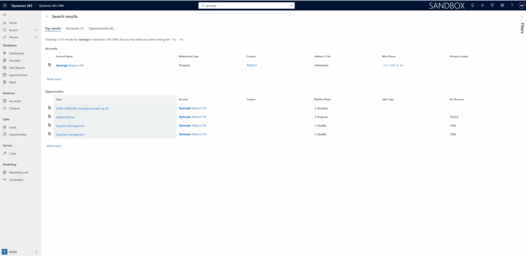Dit betekent dus dat we ook kunnen zoeken naar documenten die in Dataverse opgeslagen zijn. U kan zo dus zoeken doorheen de tekst in notities en attachements. Ook is de intelligentie van de zoekfunctie verder geoptimaliseerd door het gebruik van AI-technologie om natuurlijk taalgebruik beter te begrijpen. Zo hoeft een zoekopdracht geen exacte match meer te zijn omdat het nu rekening houdt met zaken als courante afkortingen, misspellingen en synoniemen.