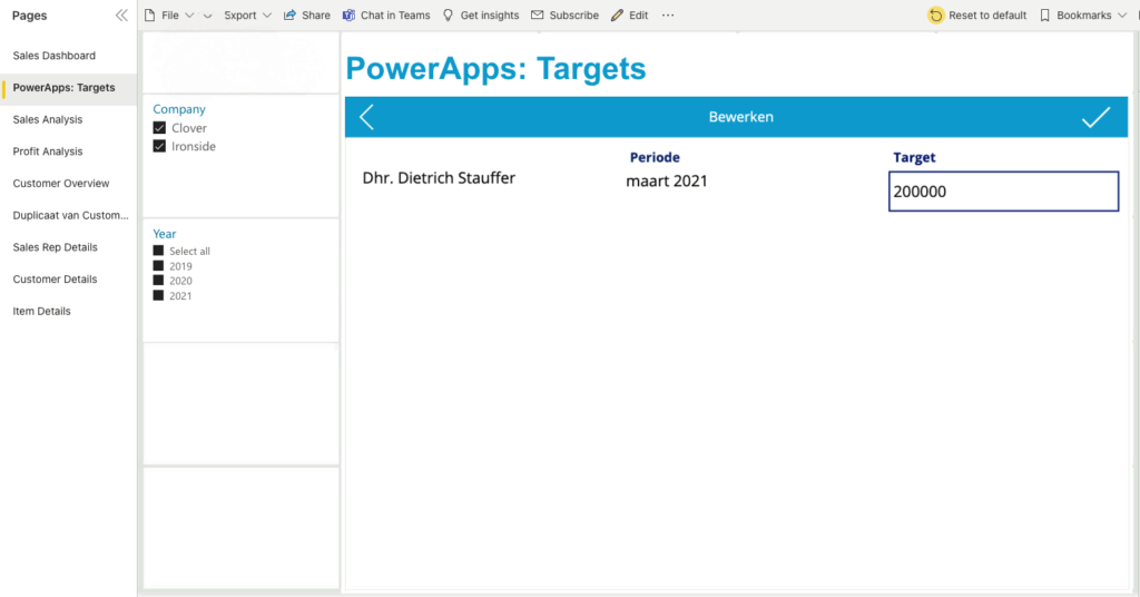 Vaak krijgen we de vraag of het ook mogelijk is om in Power BI extra gegevens aan het model of de dataset toe te voegen of bestaande gegevens te bewerken. Power BI zelf is een tool voor datavisualisatie, waarin het wel mogelijk is om bijvoorbeeld een target via een grafiek inzichtelijk te maken. Gegevens in een model of database toevoegen of bewerken kan in een aantal gevallen echter ook handig zijn, bijvoorbeeld waar het gaat om budgetten (als die niet in de bron zijn opgenomen of verkoopdoelen. Met de integratie van Power Apps in Power BI is ook dat mogelijk.