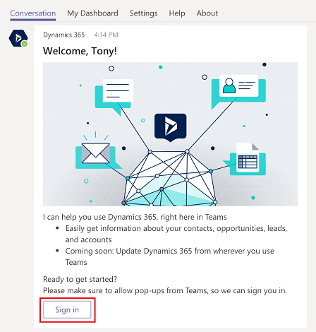 Zoek en open de Dynamics 365-bot. Open Chat aan de linkerzijde van Microsoft Teams en selecteer Dynamics 365. Het tabblad Gesprek wordt geopend met het welkomstbericht dat door de bot is verzonden. Selecteer Aanmelden.