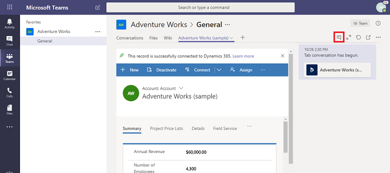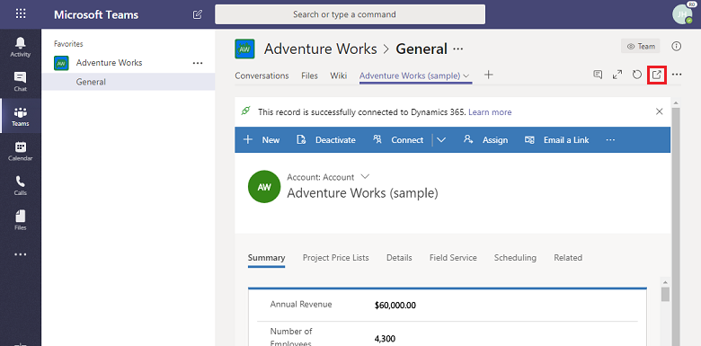 Elk lid van een Teams-kanaal kan het gekoppelde Dynamics-record bekijken, zelfs als ze geen Dynamics-gebruiker zijn. Om records ook effectief te bewerken, heeft u wel een Dynamics 365-licentie met voldoende bewerkingsrechten nodig. Wijzigingen worden automatisch in Dynamics 365 gesynchroniseerd.