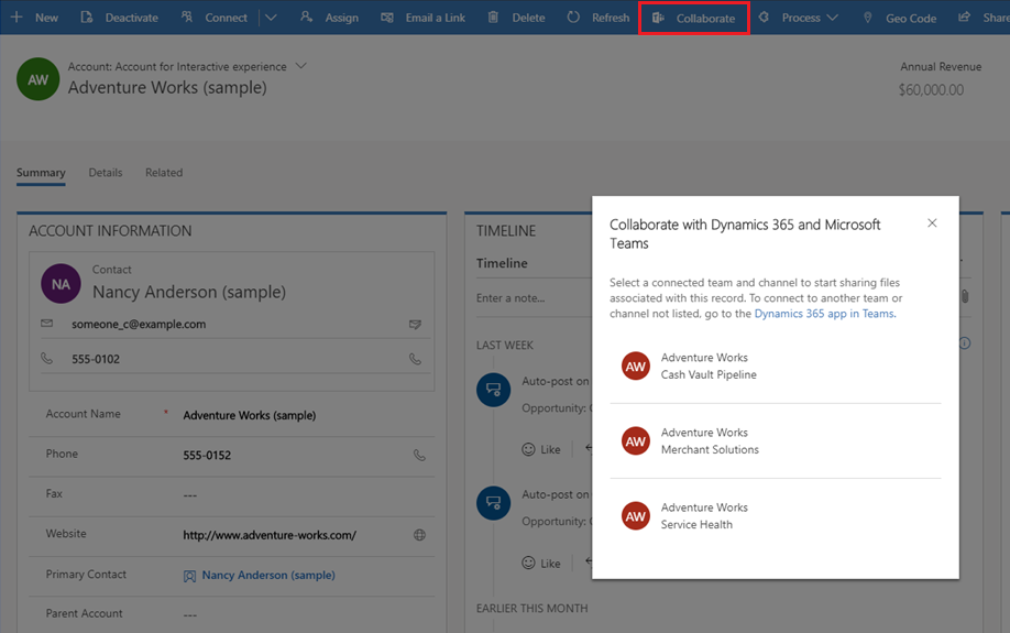 Klik op de knop Samenwerken om een record of weergave te verbinden met een Teams-kanaal.