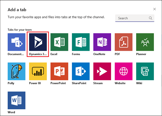 Selecteer vanuit een Teams-kanaal de knop Toevoegen+ en selecteer het pictogram van Dynamics 365.