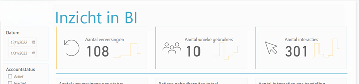Ook kan het gebruik van icoontjes erg helpen om een visual snel te begrijpen en om in één oogopslag te kunnen zien waar je naar kijkt. Zie het voorbeeld hieronder, de bovenste rand uit ons nieuwe BI gebruikersstatistieken rapport: