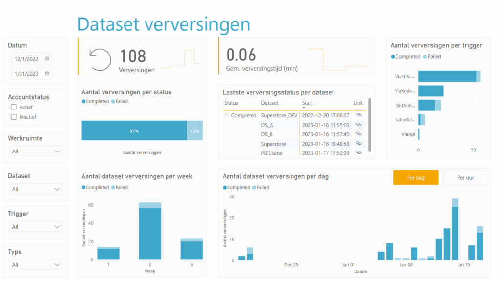Dit is een pagina uit een rapport over de gebruikersstatistieken van een Power BI omgeving:
