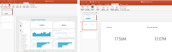 Power BI dashboards, tegels en rapportages kunnen ook door middel van de “Power BI Tiles” add-on aan PowerPoint worden toegevoegd. Het voordeel van het gebruik van deze add-on is dat de rapportages dan vanuit Power BI worden getoond. De cijfers zijn dus altijd actueel en indien er een rapportage wordt getoond is deze ook nog eens interactief. Binnen de PowerPoint slideshow kan er dus door de Power BI rapportage worden genavigeerd.