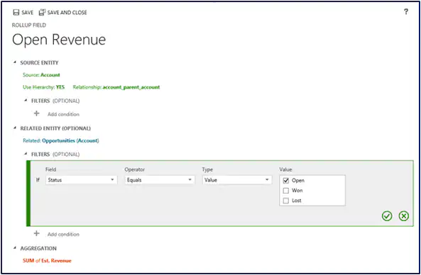 Rollup velden worden gebruikt om geaggregeerde waarden te berekenen (b.v. een veld op het Account formulier dat de ‘estimated revenue’ samentelt van alle open opportuniteiten die verbonden zijn aan die bepaalde Account. Hiermee krijgt u een duidelijk beeld wat de totale ‘open revenue’ bedraagt per Account).