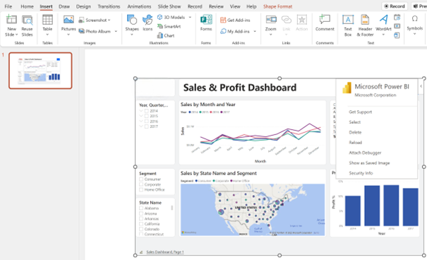 Wanneer de Power BI rapportage ingevoegd is in PowerPoint is de volledige interactie nog steeds beschikbaar. Zaken als filteren, Drill down en uitvergroten van 1 rapport element is nog steeds mogelijk. Het delen van de PowerPoint is via de verschillende standaard manieren mogelijk, maar andere kunnen alleen de Power BI rapportage gebruiken als ze daar in Powerbi.com ook bij kunnen. Alternatief is om bij een ingevoegde Power BI rapportage de optie “Show as Saved Image” aan te zetten.