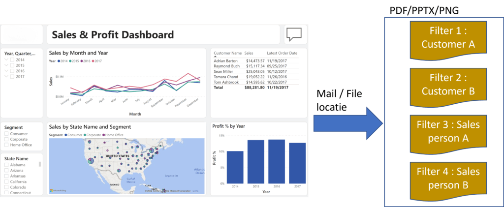 In dit geval worden verschillende gefilterde versies van hetzelfde Power BI rapport verstuurd naar verschillende Email ontvangers en worden ze ook opgeslagen op een SharePoint Online locatie. Uiteraard kan ook alleen voor mail verzenden of SharePoint locatie gekozen worden of er kan zelfs nog een SFTP-actie aan gekoppeld worden.