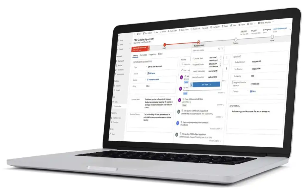 Met Dynamics 365 Sales beheren verkopers accounts en contactpersonen, volgen ze verkooptrajecten van prospect tot order op en onderhouden ze klantrelaties, inclusief klachtenopvolging. Dankzij inzichten kunnen ze gerichter werken en sneller deals sluiten.