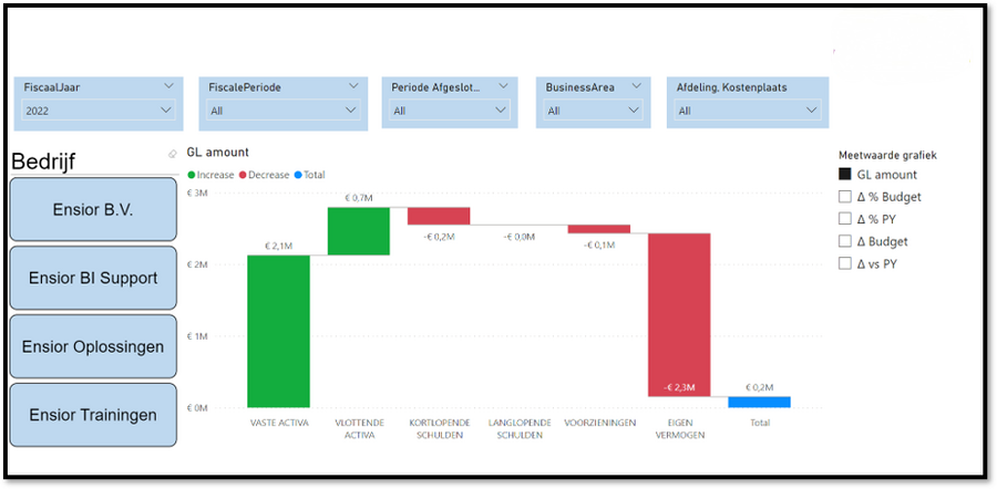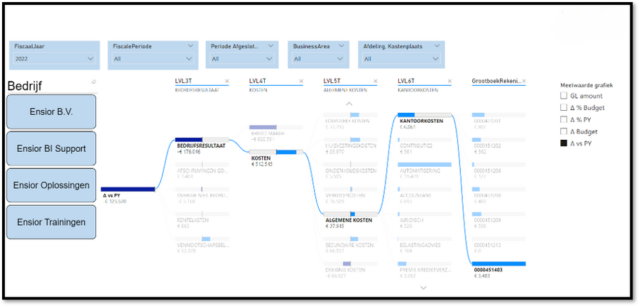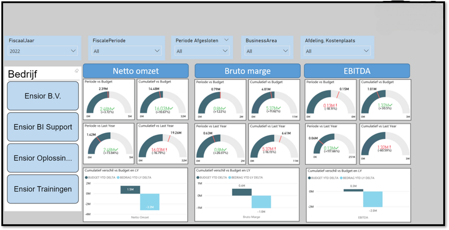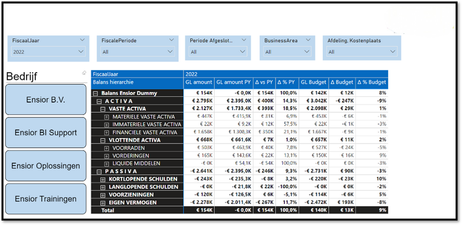 Vaak is de wens er nog om dit soort rapportages op meer velden te kunnen filteren dan standaard of juist Row Level Security in te bouwen zodat bepaalde personen alleen de data kunnen zien van hun eigen unit of bijvoorbeeld land/regio. Een andere belangrijke wens is ook om dit soort overzichten te kunnen consolideren. Zeker wanneer er sprake is van meerdere administraties die bij sommige softwarepakketten ook nog eens in meerdere databases zijn opgeslagen. Een overkoepelde hiërarchie voor grootboekrekeningen kan dan onderdeel zijn voor de oplossing wanneer hiërarchieën voor verschillende administraties anders zijn ingericht. Zie hieronder ook een Power BI voorbeeld met een filter waar verschillende bedrijven(administraties) geconsolideerd kunnen worden.