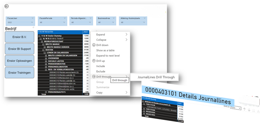 Door de benodigde velden uit de hiërarchie voor grootboekrekeningen in je Power BI visual op te nemen heb je automatisch de mogelijkheid om door te drillen naar het laagste niveau. Vaak is er ook nog de wens om vanuit grootboekrekening do or te drillen naar onderliggende boekingen zoals bijvoorbeeld facturen of journaalregels. Een stukje intelligentie in het modeleer werk maakt het dan mogelijk zoals bijvoorbeeld hieronder door te drillen vanuit een grootboekrekening naar onderliggende journaalregels.