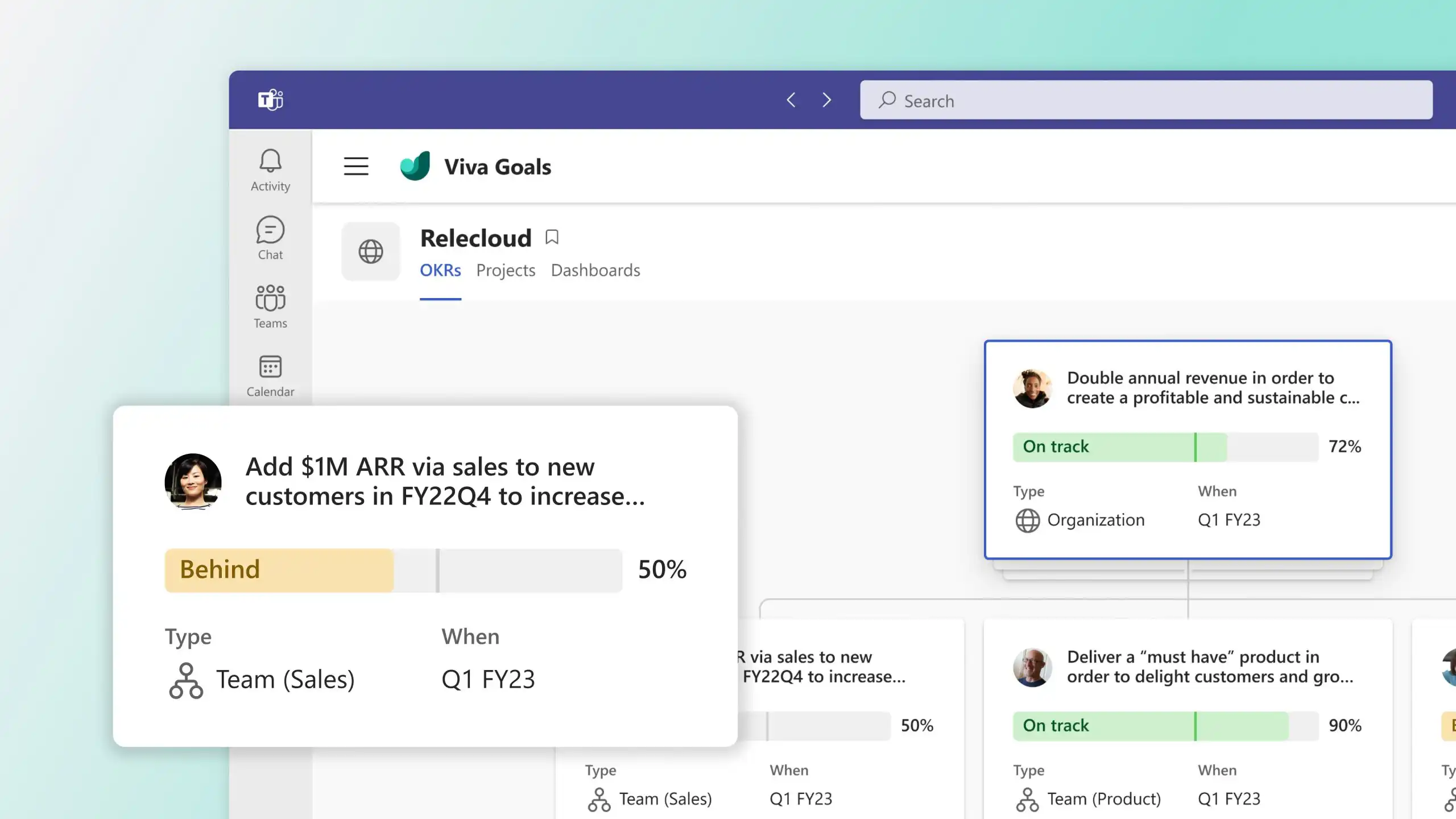 Viva Goals helpt je medewerkers op één lijn te komen en verenigt hen rond een gedeelde missie en een gemeenschappelijk doel. Zo maakt Viva Goals het hen makkelijker om verbinding te maken met gegevens, automatische herinneringen te ontvangen over deadlines en vergaderingen, en de voortgang in de hele organisatie bij te werken via aanpasbare dashboards en snelkoppelingen.